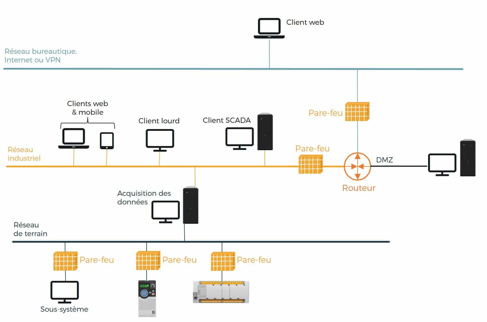 C’est une architecture déconseillée pour des raisons de sécurité et également pour des raisons de sûreté de fonctionnement des installations. Ce n’est pas pour autant qu’il faille se passer des clients web et mobile pour tous les avantages qu’ils représentent. Ce n’est pas non plus une raison pour interdire les accès distants ou encore l’usage d’un poste ayant une patte sur le réseau de terrain et une patte sur le réseau bureautique.