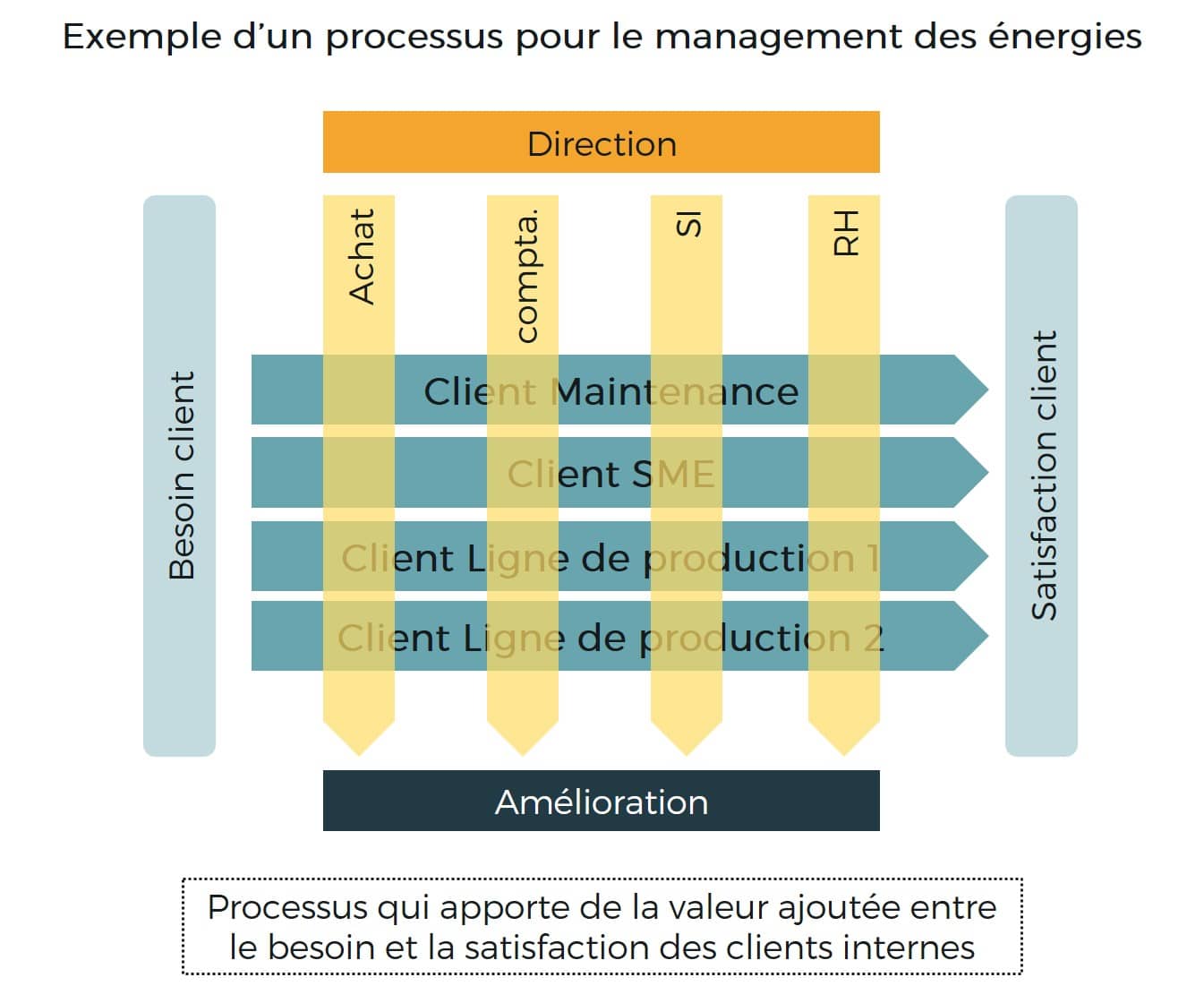 Sur ces points de la partie « Do » les exigences sont plus complètes ; la version 2018 renforce la notion de maîtrise des processus associés aux Usages Énergétiques Significatifs (voir exemple simplifié d’un processus ci-dessous) qui sont les postes ou parts importants de la consommation énergétique.